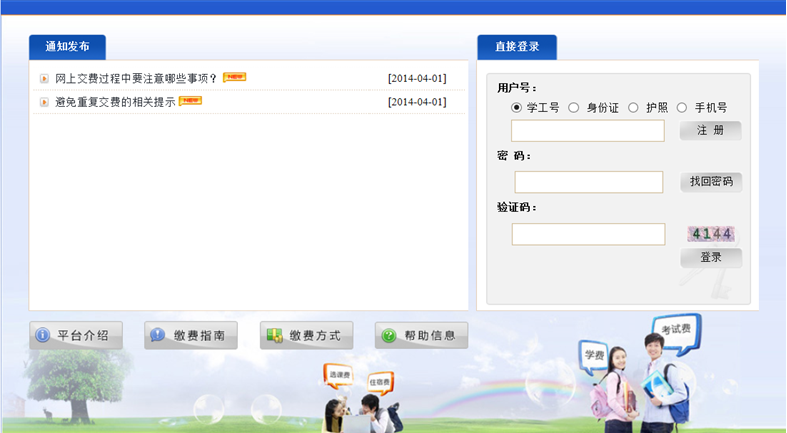 在图1-1 系统登陆界面中,输入相应的用户名和密码点击 “登录” 按钮,如果用户名和密码正确便可登录进入缴费平台系统。学校教职工登陆的用户名和密码与登陆财务处高级查询平台是用户名和密码一致,在校学生登陆的用户名和密码均为学号。